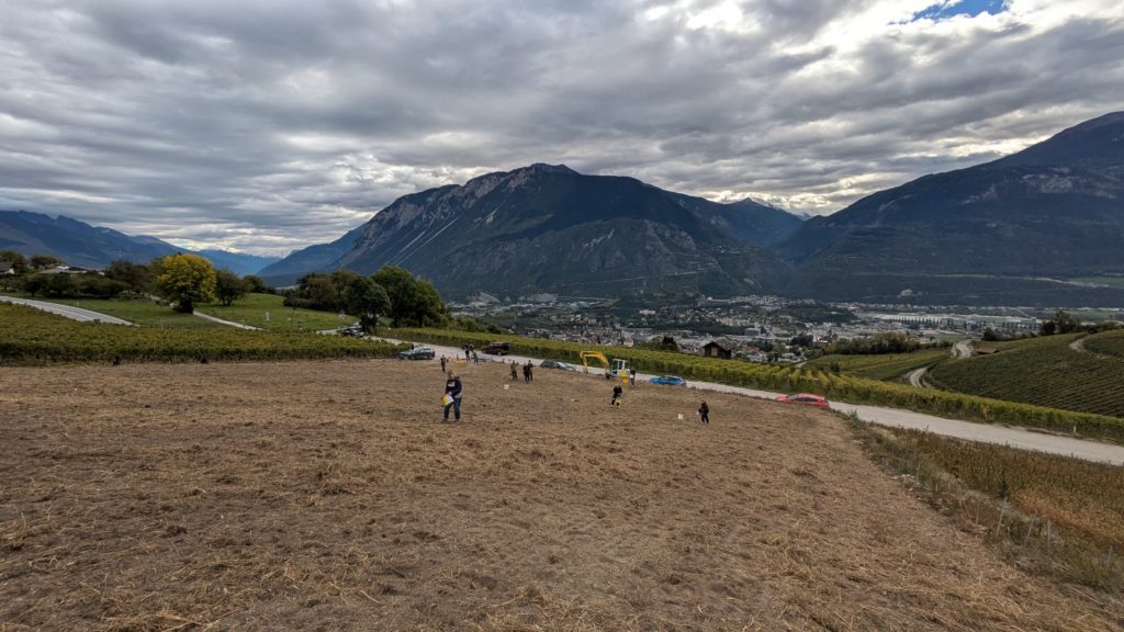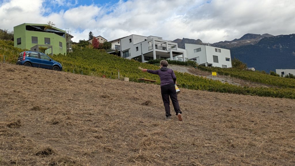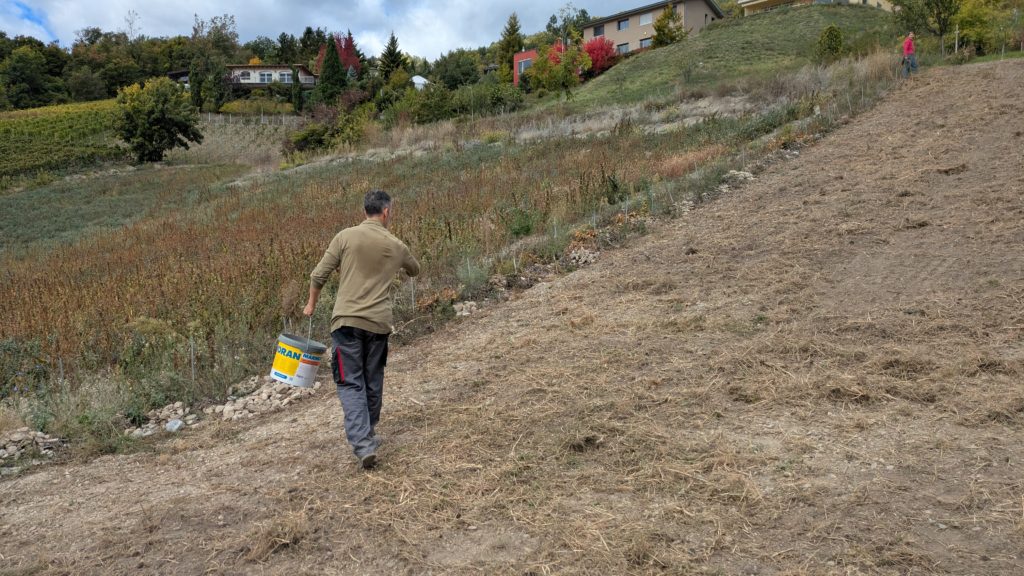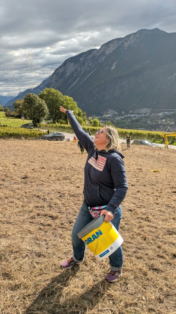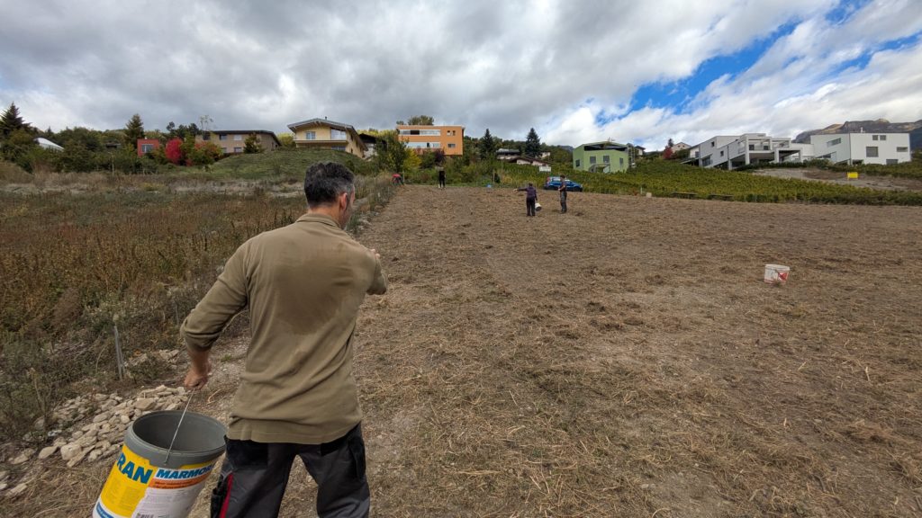 Après un briefing de Sabine et Sam, nous avons retiré les cailloux du champ, puis avons nettoyé les abords du champ, avant de semer à la volée les grains de seigle sous l’oeil attentif de Sam. Pas si facile qu’il n’y paraît…
